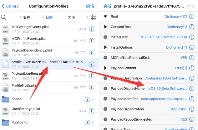 然后找到 Profile 开头文件,可能会显示很多个 Profile 开头文件,这时你就需要找到 tvOS26 文件,对每一个 Profile 开头文件都打开,点击 Root 选项,再看看 PayloadDisplayName 选项是不是 tvOS26。