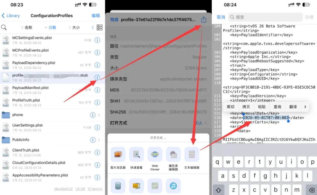 确定这是 tvOS26 文件,使用文本编辑器打开,然后找到 RemovalDate 选项,自行修改日期也行,修改好后,点存储完成就行。