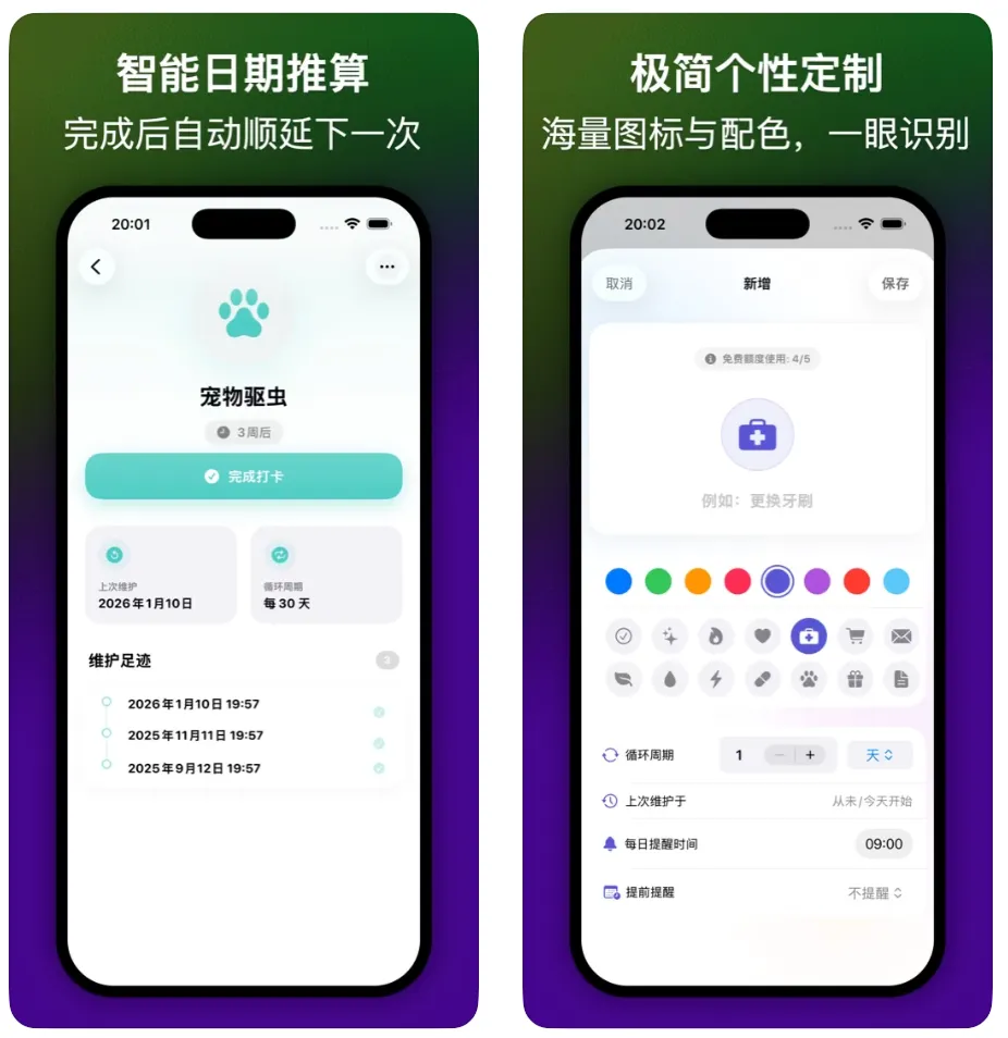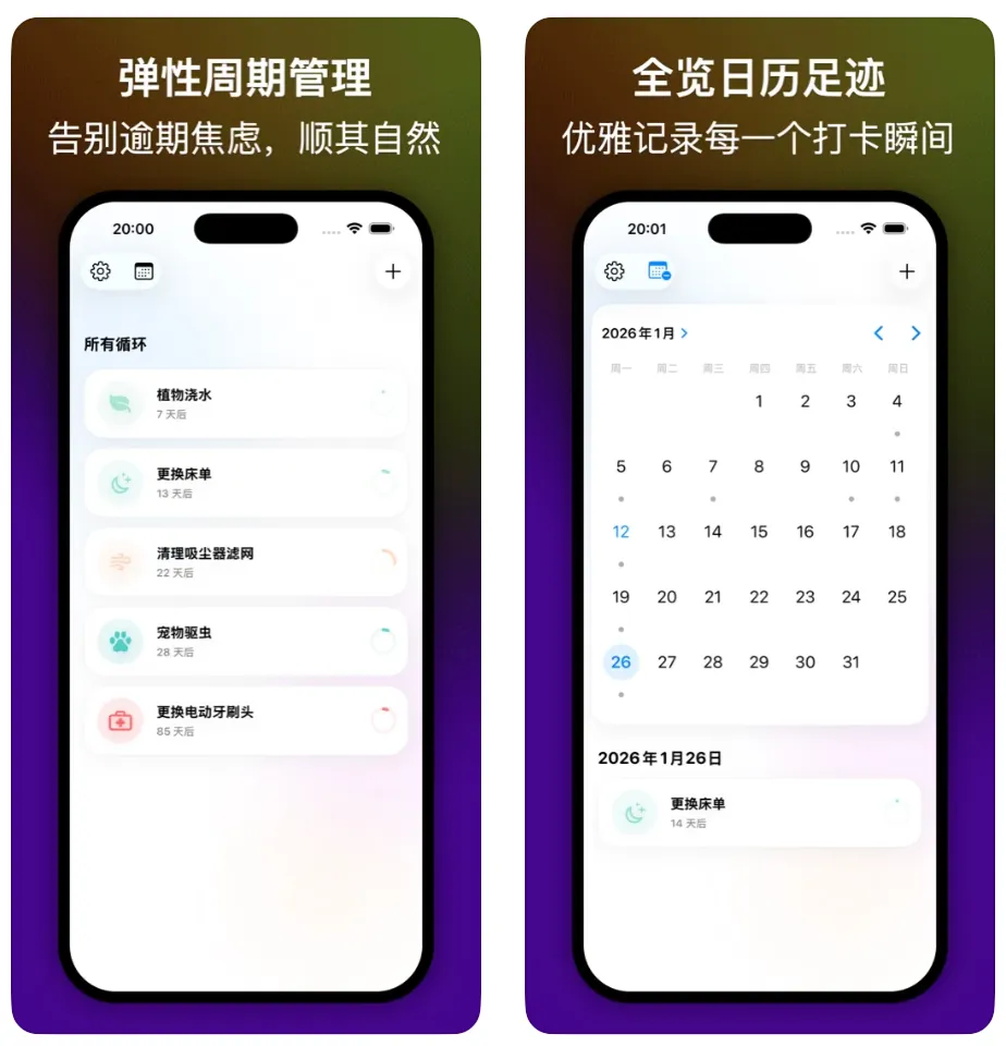 一款拒绝焦虑的周期性生活管理工具,它不强迫你在固定日期“打卡”,而是根据实际完成的时间,智能推算下一次日程!
