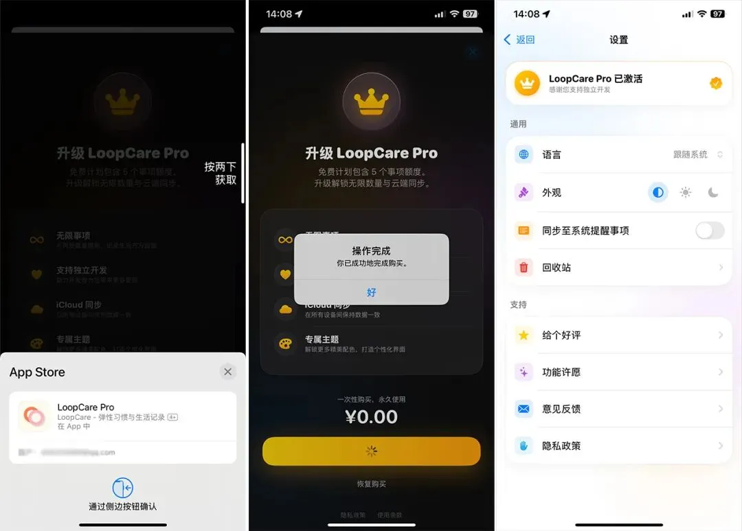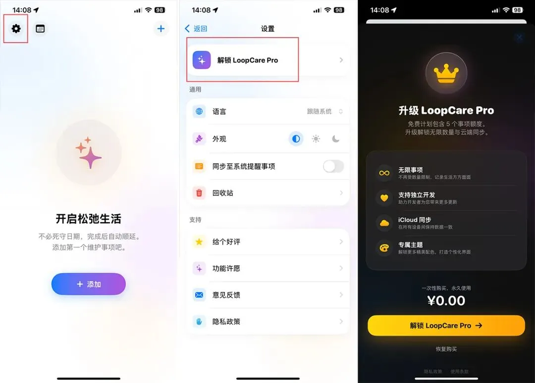 2,内购界面,选择 Lifetime ¥0.00 选项,点击底部按钮进行购买。