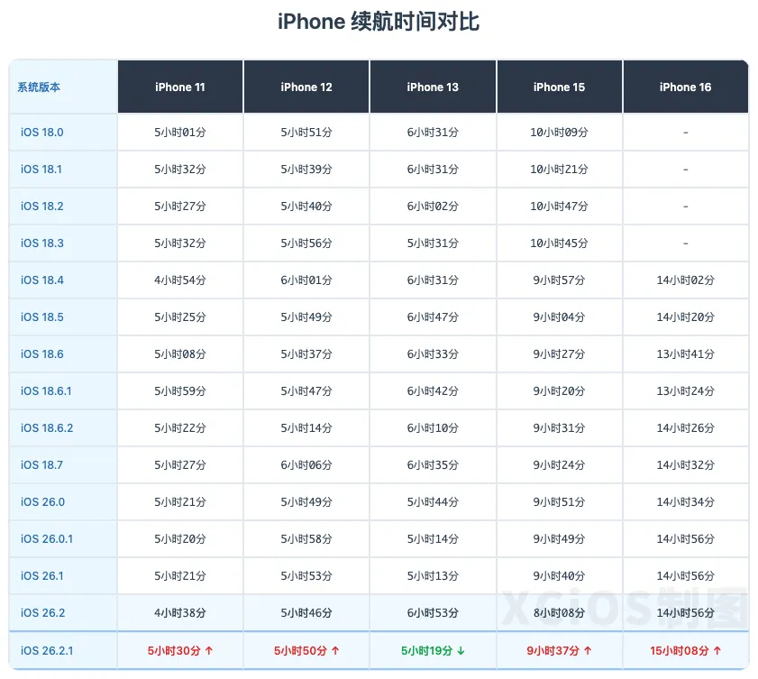 本周苹果发布了 iOS 26.2.1 正式版系统,虽然此版本主要是为了 AirTag 2 准备的,但毕竟也酝酿了这么久,苹果也在开发者日志中表示对系统进行了优化。但对于普通用户而言,我们更多在意的还是此版本续航到底怎么样?相比之前版本续航水平如何?近日海外博主 iAppleBytes 给我们带来了 iOS 26.2.1 正式版的续航测试对比。测试方法和之前一致,将所有设备的亮度以及功能设置统一,然后使用 Geekbench 4 自带的续航测试功能来进行测试至没电关机。本次测试的设备为:iPhone 11、iPhone 12、iPhone 13,iPhone 15 以及 iPhone 16,具体对比上个版本续航水平如下:iOS 26.2.1 续航时间 5 小时 30 分↑↑iOS 26.2.1 续航时间 5 小时 50 分↑iOS 26.2.1 续航时间 5 小时 19 分↓↓iOS 26.2.1 续航时间 9 小时 37 分↑↑iOS 26.2 续航时间 15 小时 08 分↑整体来看,iOS 26.2.1 正式版的续航水平远超我的想象,在测试设备中只有 iPhone 13 出现了严重下滑的情况,但仔细一看也可能是上次的数据过于夸张导致。大家也可以仔细看一下我做的续航对比图表,用来参考自己是否适合升级系统,当然了,这种续航测试仅仅是在特定软件和环境下的数据,并不代表所有人的情况。不得不说,这次的结果远超了我的心理预期,就是不知道各位在升级到 iOS 26.2.1 正式版之后,日常使用的续航是否有较大的变化呢?欢迎反馈。