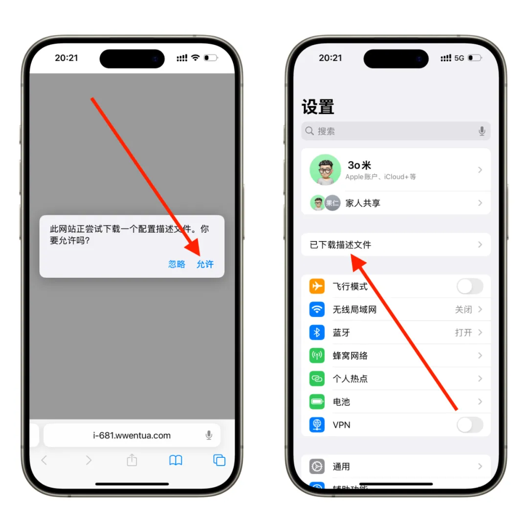 在文章最底部查看并获取描述文件下载地址,获取后复制地址在Safari浏览器中打开,进行下载描述文件,下载后即可在设置主界面查看到已下载的描述文件。