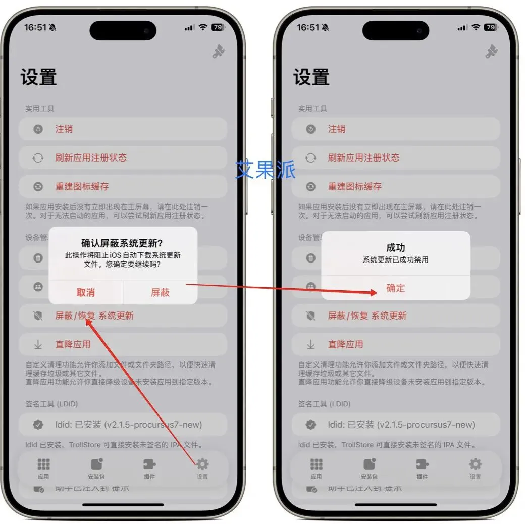 打开巨魔“设置”﹥红字“屏蔽/恢复系统更新”点击“屏蔽”即可。恢复更新也是这个按钮。