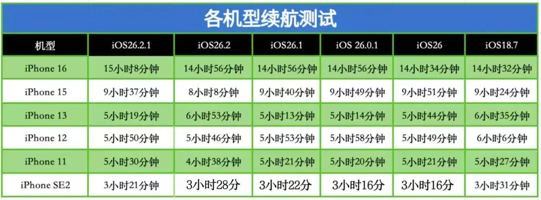 iPhone12从iOS26.2升级到iOS26.2.1续航提升4分钟;变化不大