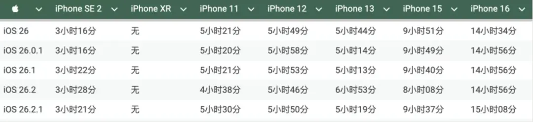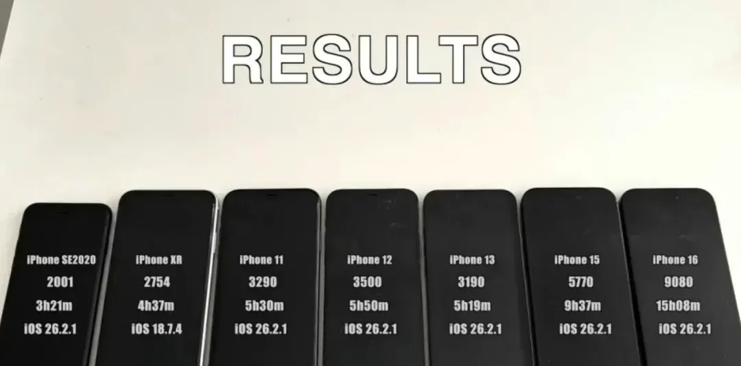 根据测试结果来看,与 iOS 26.2 相比,除了 iPhone 13 以及 iPhone SE2 续航能力下降之外,其余机型的续航能力均有所提升,具体情况如下:
