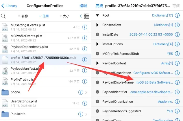 - 逐个打开 Profile 开头文件,点击 Root 选项,通过查看 PayloadDisplayName 选项是否为 tvOS26,完成目标文件识别。