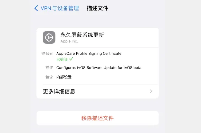tvOS 18 描述文件正式失效,务必及时更换为 tvOS 26 版本。在使用 tvOS 18 的设备,从今日起屏蔽功能彻底失效。一旦失效,设备会收到 iOS 26 系统更新包,甚至可能触发自动更新。tvOS 18 描述文件的代码中,早已明确标注该文件的到期时间为 1 月 31 日,下方就是代码里的具体日期标注,而这个到期信息仅能从代码层面查询到。想要阻止 iOS 系统自动升级,唯一的常规方法就是安装 tvOS 描述文件。除非你的设备已经完成越狱或通过巨魔进行了修改 —— 这两种方式能实现永久屏蔽升级。而对于不想越狱、也不想用巨魔的用户来说,安装 tvOS 描述文件是必选的屏蔽方式。原因其实很简单:设备一旦检测到新系统,就会弹出更新提醒,而这个提醒的交互设计存在误导性,稍不注意点错 “稍后更新”,就可能误将设备升级到最新系统,遇上这种情况真的特别闹心。-- 更换 tvOS 26 屏蔽升级教程 --