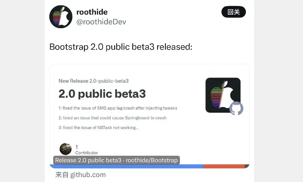 没想到!Roothide 大佬还为 Bootstrap 半越狱更新,这次推出 Bootstrap 2.0 Public beta 3 公测,相比上一个版本更加的稳定,但还未达到正式版,仍在猥琐发育中,仅提供公开测试。