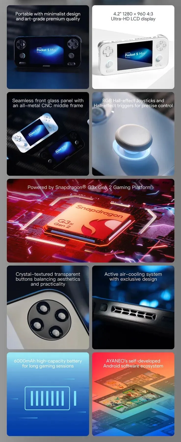继 Pocket Ace、Pocket DS、Pocket DMG、Pocket Evo 与 Pocket S(目前亚马逊售价 479.99 美元)之后,Ayaneo 推出了旗下最新款安卓掌机Pocket S Mini,该机搭载高通骁龙 G3x Gen 2 处理器。简而言之,Pocket S Mini 是该系列中体积最小的机型,机身尺寸为 167×78×18.5 毫米,重量仅 305 克。即便如此,这款全新掌机仍配备了 6000 毫安时电池、主动散热系统以及霍尔效应操控组件。