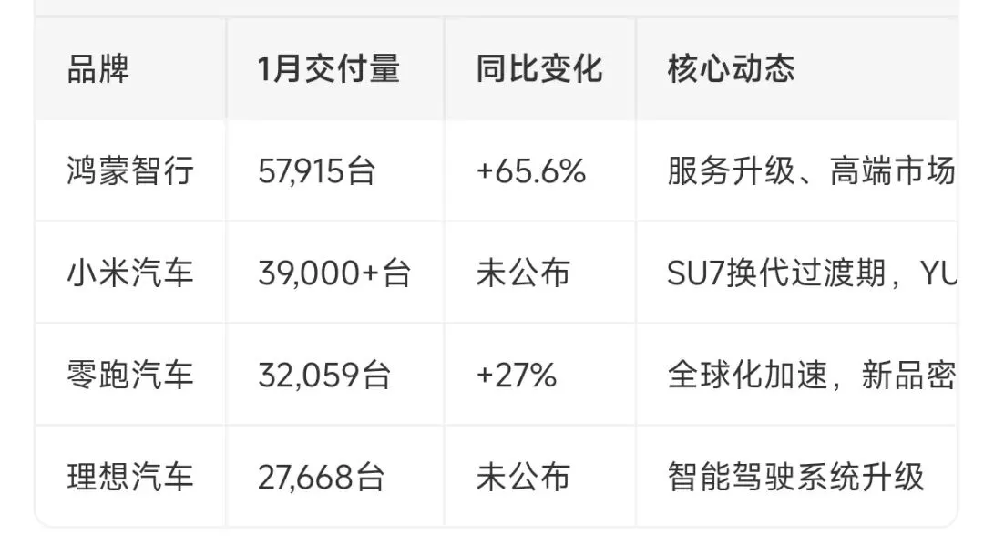 小米、鸿蒙、理想等多家车企公布1月交付量,鸿蒙智行排名第一