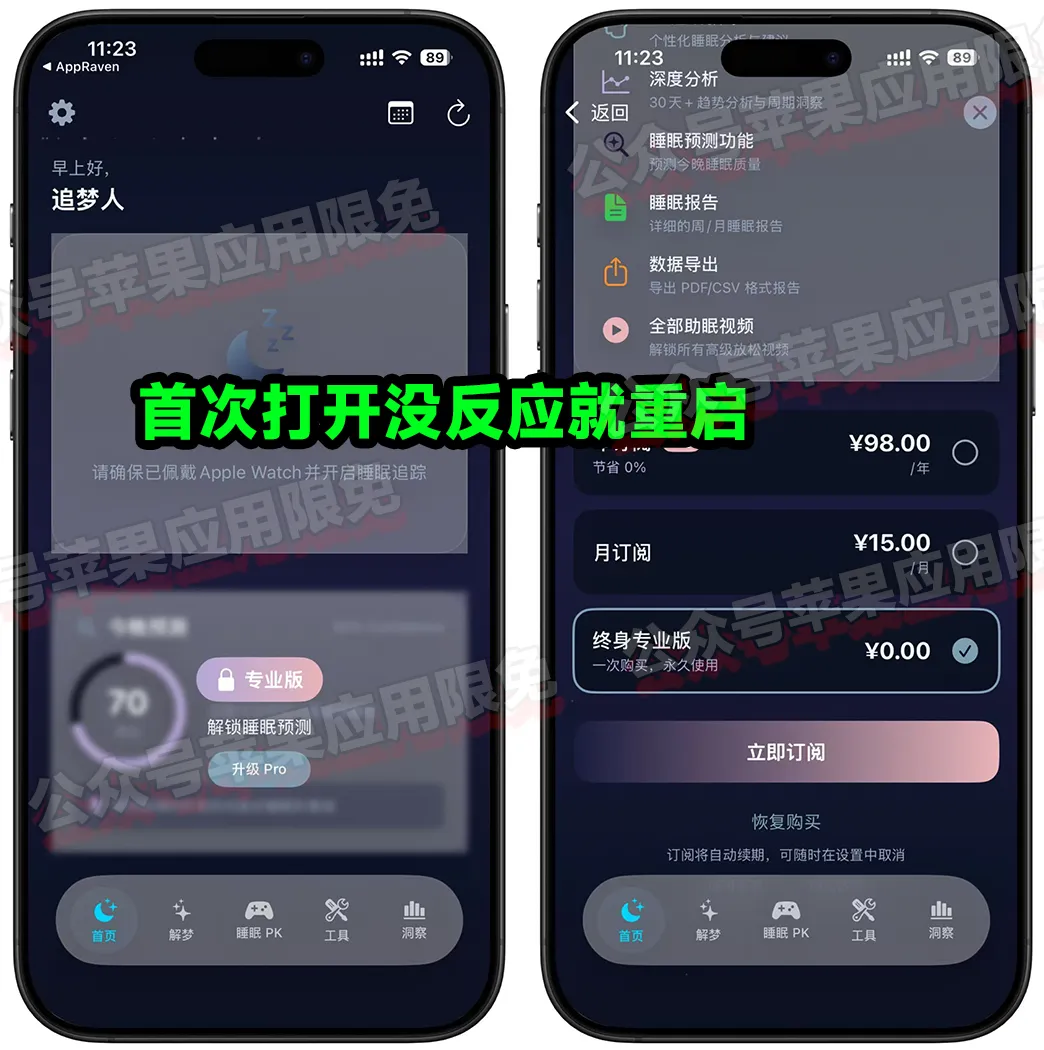 一款专注于睡眠健康管理软件,目前可以免费获取永久完整版,打开软件从主页点击升级进入内购,没反应就重启软件,设备需装有 iOS 18.0 或更高版本健康健美