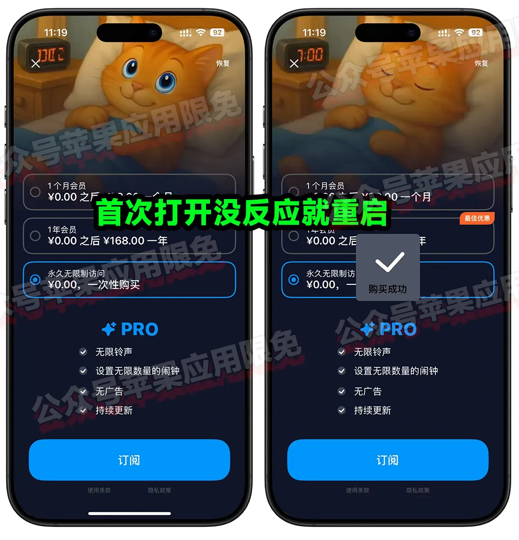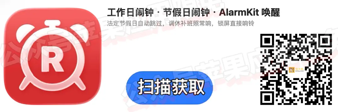 软件名称:工作日闹钟 · 节假日闹钟 · AlarmKit 唤醒一款智能闹钟,目前可以免费获取它的终身订阅,打开软件就会弹出内购,显示0即可免费获取,软件需 iOS 26或更高版本
