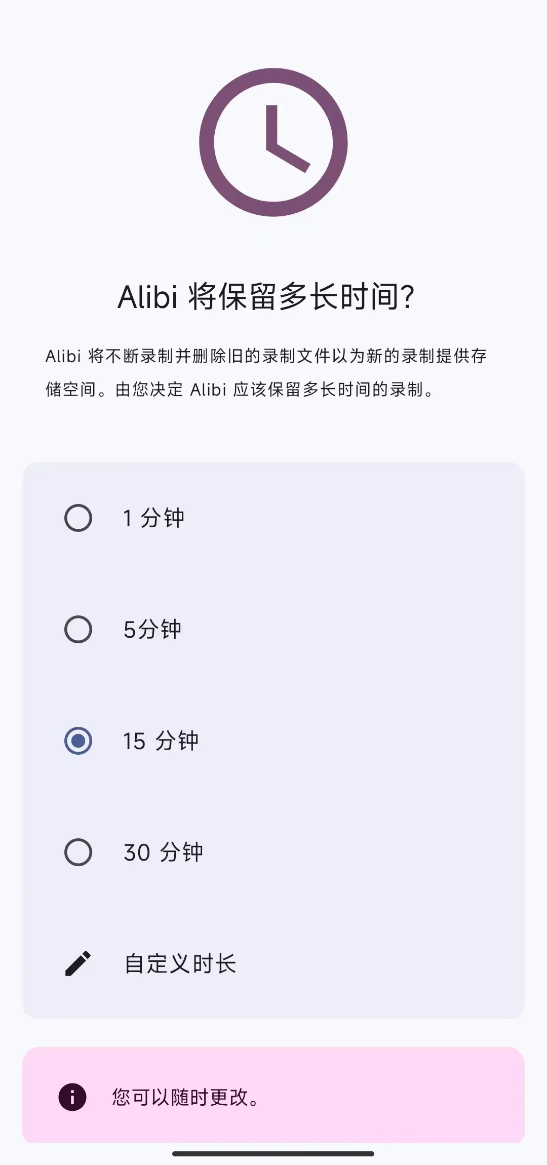安装好软件后,第一步就能根据自己的需求设置录像保留时长,可选预设的 1 分钟、5 分钟、15 分钟、30 分钟,也能自定义时长,不用担心录像文件占满手机内存。