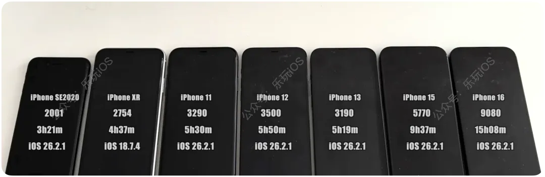 ,今天带来国外博主@iAppleBytes关于iOS 26.2.1 正式版,总共7款设备的续航测试结果