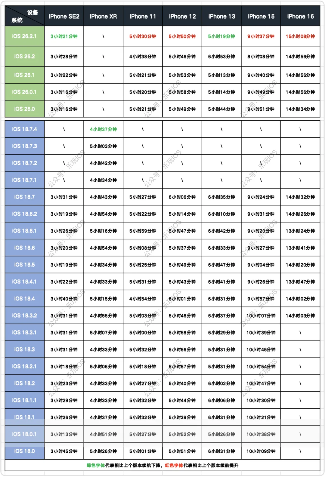 iOS 26/18系统历史各版本及各设备续航测试列表