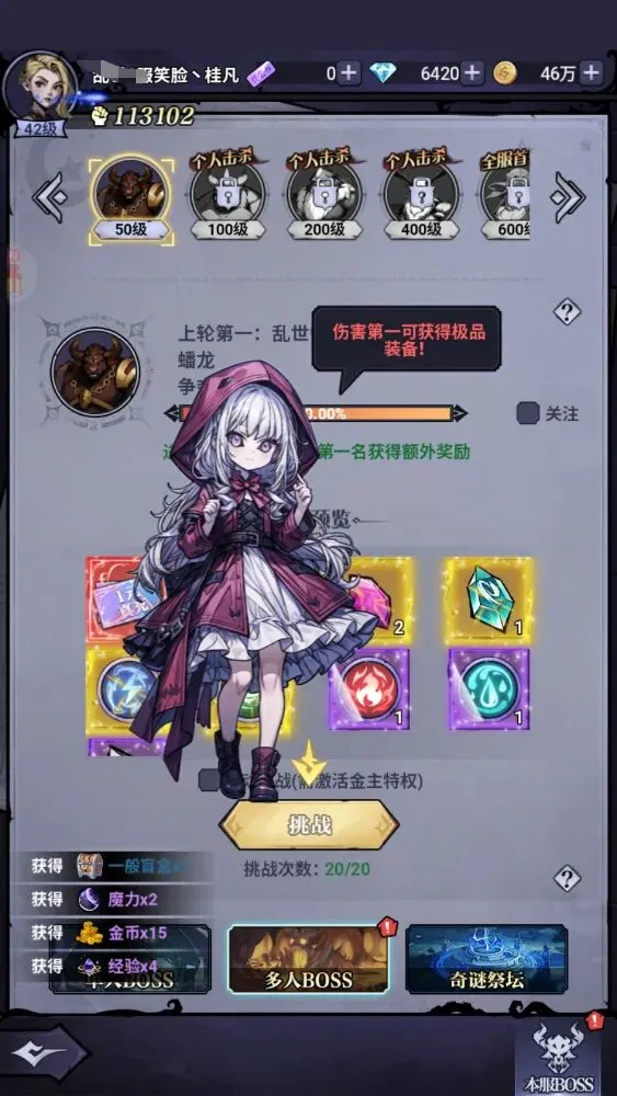 5、BOSS副本包括单人、多人、奇谜祭坛等多种类型,挑战不同等级的BOSS掉落的材料也会有所不同,玩家激活特权后可以开启自动挑战模式