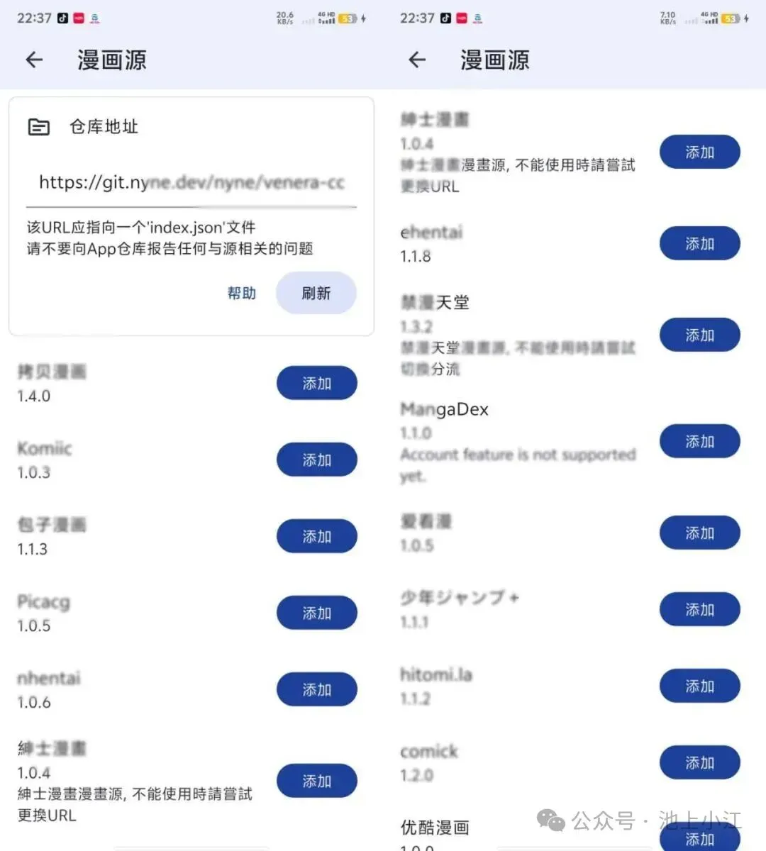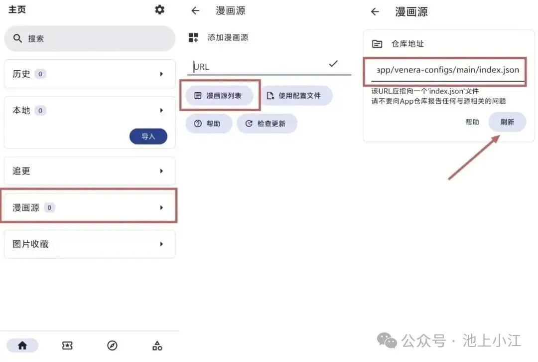 进入软件之后点击【漫画源】-【漫画源列表】,不用导入什么源,直接点击刷新即可!然后添加想看的漫画源就行,如果报错就返回上个界面重新添加