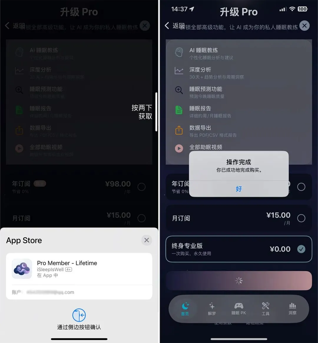 1,打开 App,按引导一步步继续进入主界面,点击下方 升级Pro 按钮,进入内购页面。2,内购界面,选择 终身专业版¥0.00 选项,点击底部按钮进行购买。