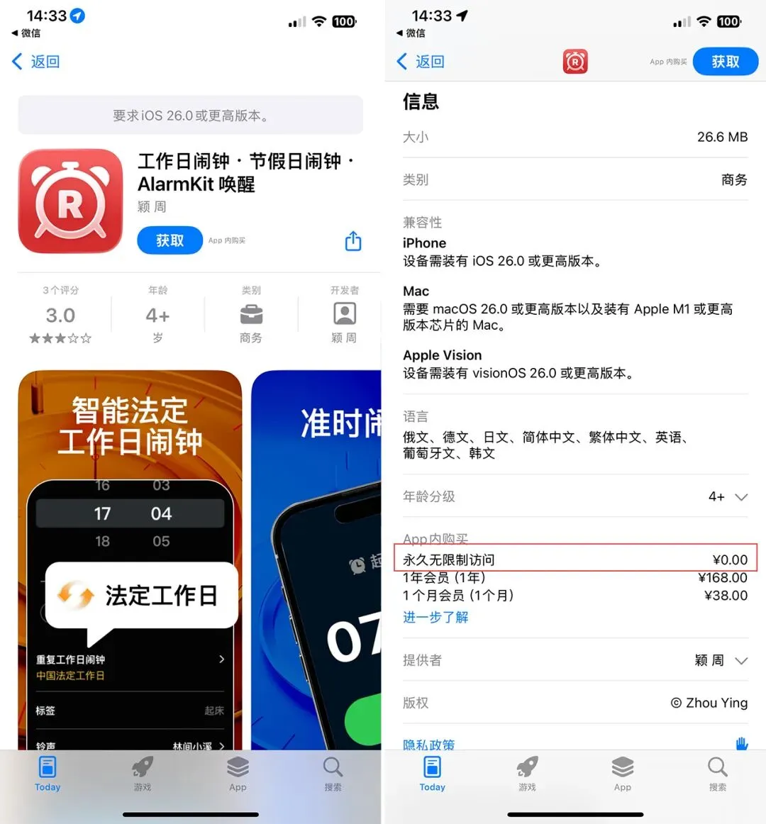 介绍:一款智能日历闹钟应用,基于 Apple 最新的AlarmKit 框架开发,能够自动识别法定工作日与节假日,智能调整闹钟设置,避免节假日被吵醒或调休日错过闹钟。价格:¥终身版→0