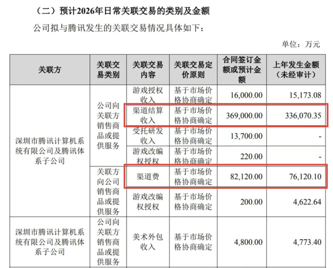 【4】在业绩公告前,世纪华通还发布了关于2026年度日常关联交易预计的公告,世纪华通集团与腾讯方在游戏研发及运营、美术外包、支付结算、服务器租赁等方面进行业务合作。预计2026年度的日常关联交易总金额为人民币50亿元,其中,渠道结算收入和渠道费的预计金额分别是36.90亿元和8.21亿元。