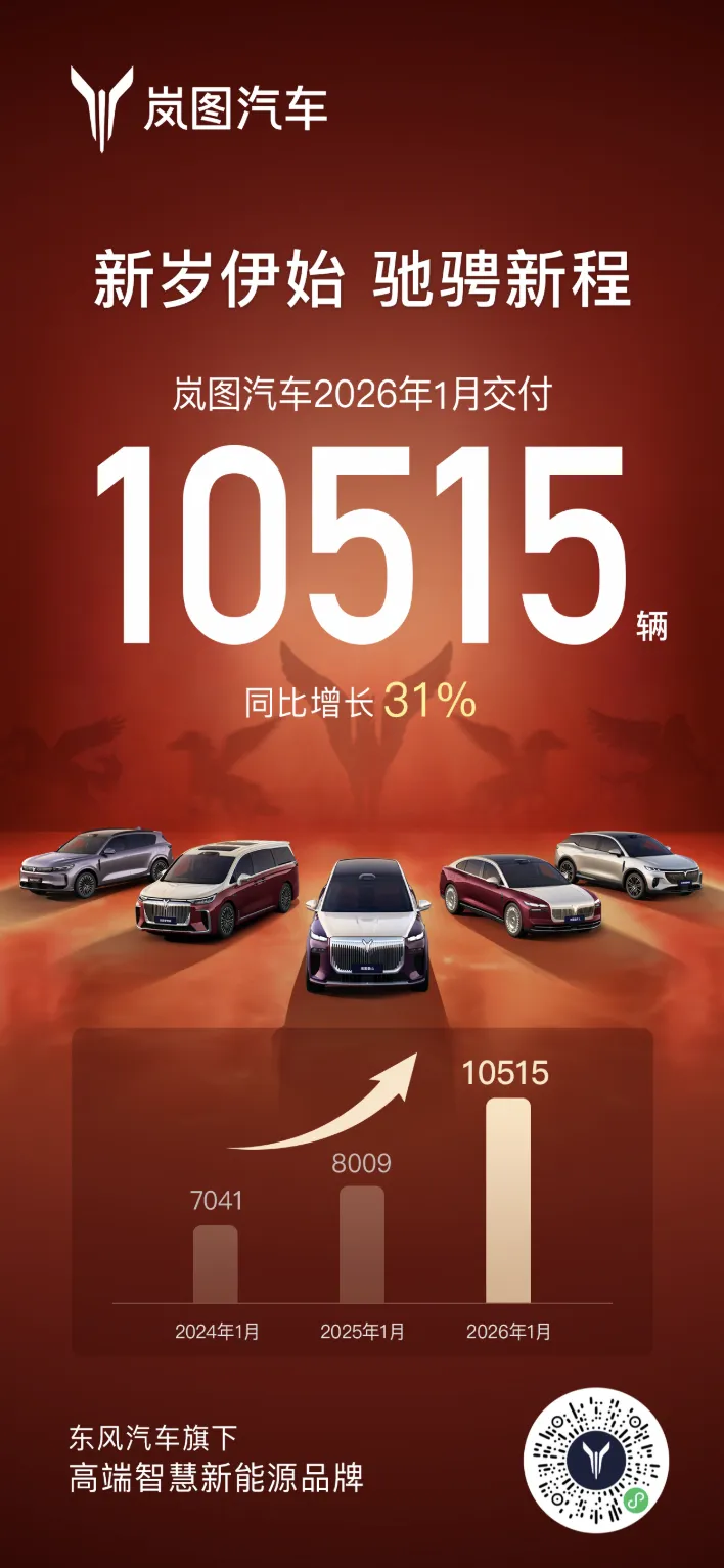 同比环比均下跌,小鹏25年销量无疑是强势起飞的一年,但是有个不能忽视的问题,除了mona成了销量常青树,其余车型均出现了发布即爆款,但是两三个月就疲软的情况。目前打造稳定的产品矩阵,尽快发布和mona一样的销量保证产品很重要啊。岚图汽车:10515辆(环比-34%,同比+31%)岚图在25年销量一直保持的不错,在和华为深度合作后,也即将推出首款搭载L3级智驾的岚图泰山Ultra,非常看好岚图后面的表现。