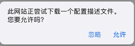 首先获取描述文件链接,要使用自带的safari浏览器打开,弹出窗口中点击允许。