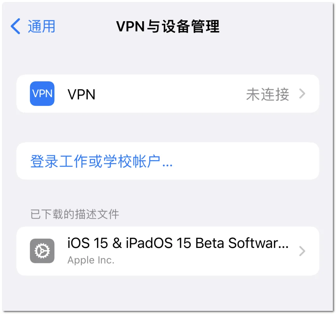 若没有找到,可前往【通用】的【VPN与设备管理】查找。(除safari外下载的描述文件可能无法正常识别)