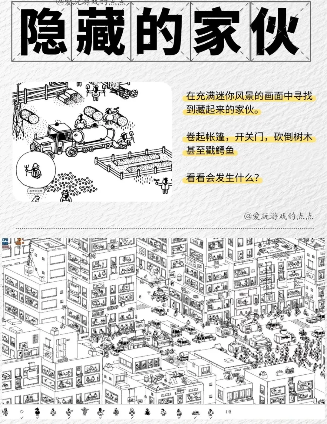在充满迷你风景的画面中寻找到藏起来的家伙。卷起帐篷,开关门,砍倒树木甚至戳鳄鱼看看会发生什么