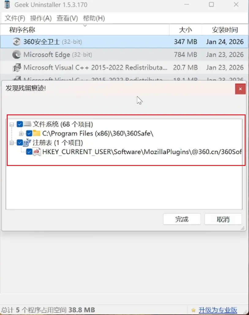 2、Geek免费版:扫描出少量残留,安装目录下仍有部分文件 ❌