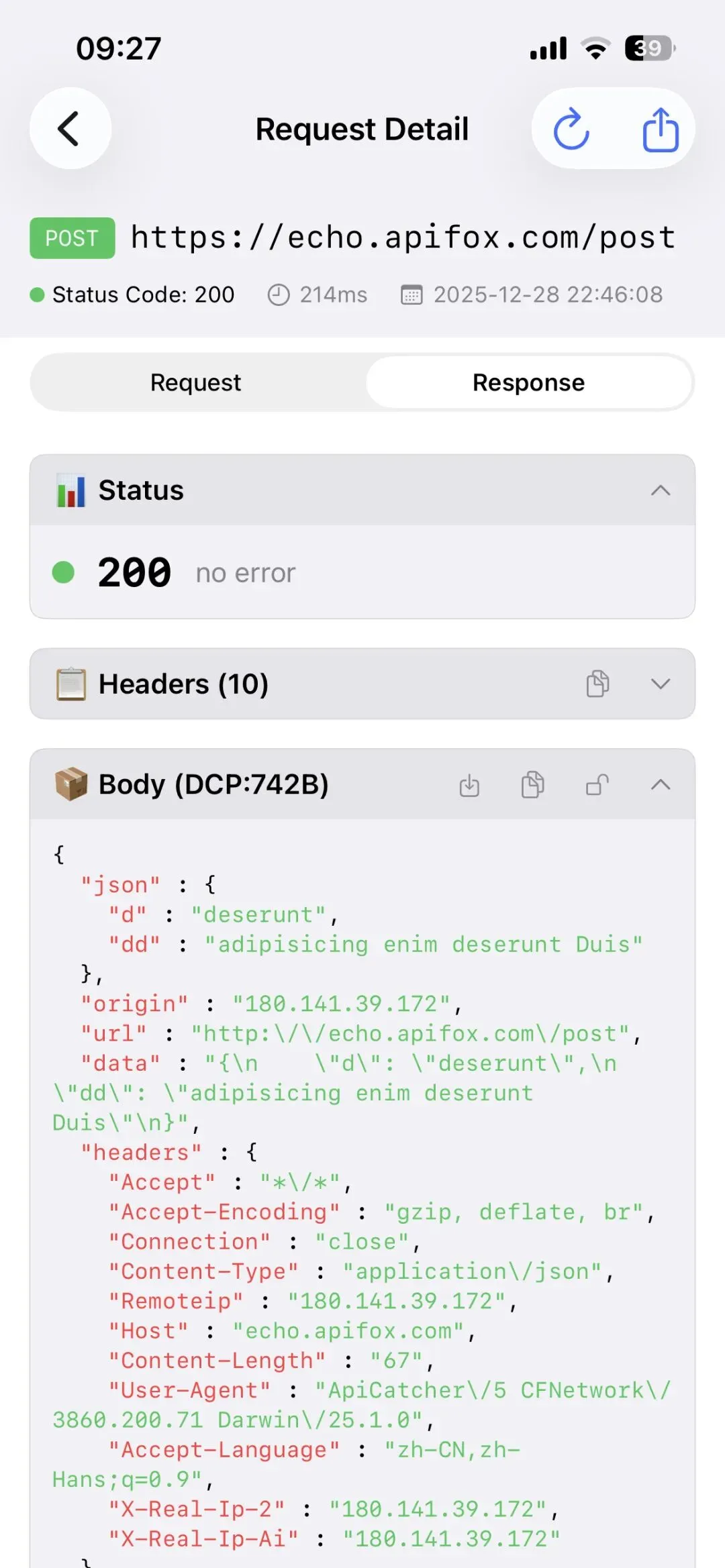 点击进入请求详情页,请求详情页布局只分请求和响应两个Tab,其它同类产品看请求完整信息要切换多个Tab,我们是把内容聚焦而不是分散。并且每个部分都是卡片显示,内容格式化和高亮显示,可读性好,提供复制按钮快速复制内容。默认我们会更关心请求体和响应体,所以请求头和响应头默认折叠。