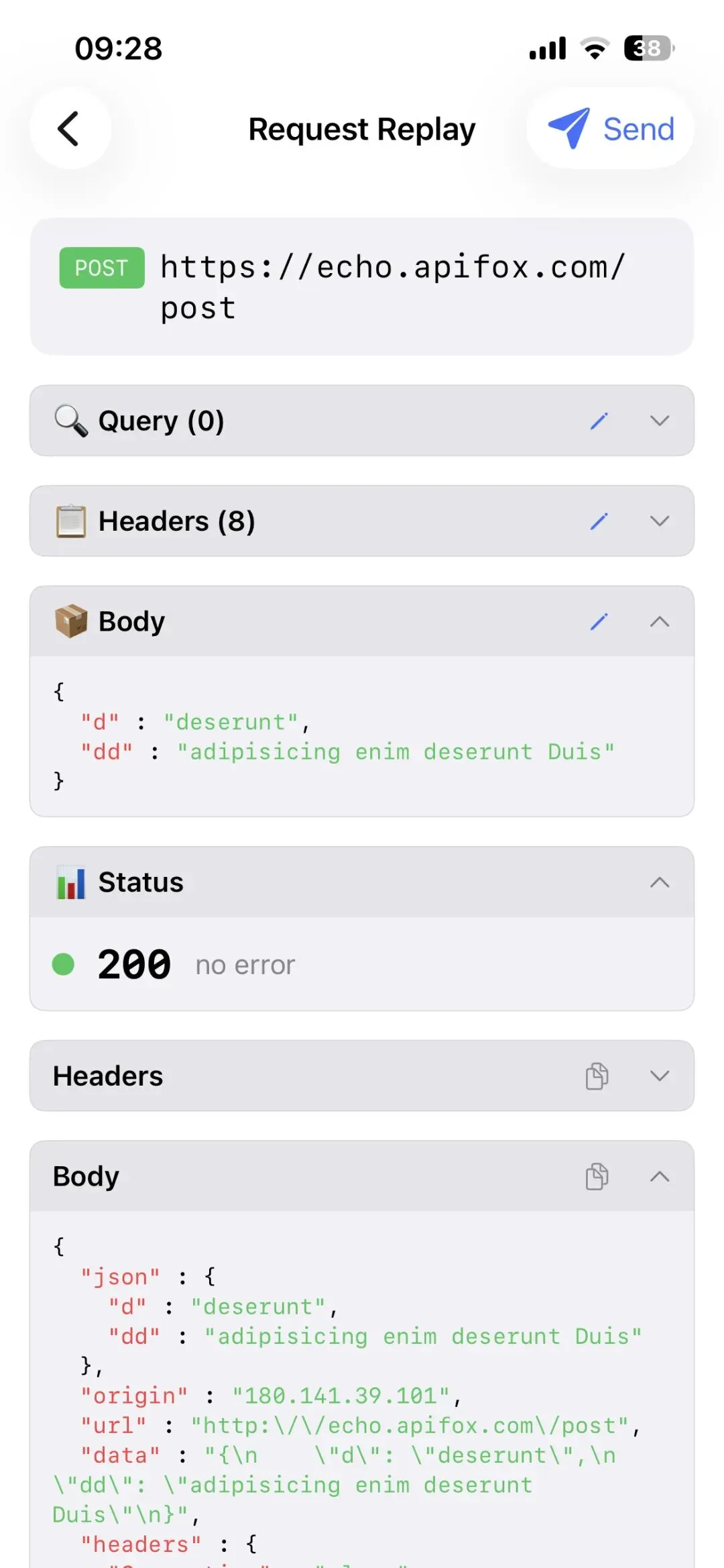 API文档是借鉴了Apifox的,请求头响应头会剔除非自定义Key,只保留Content-Type和授权头。请求Body和响应Body会解析为数据结构,看起来更直观,并提供示例。