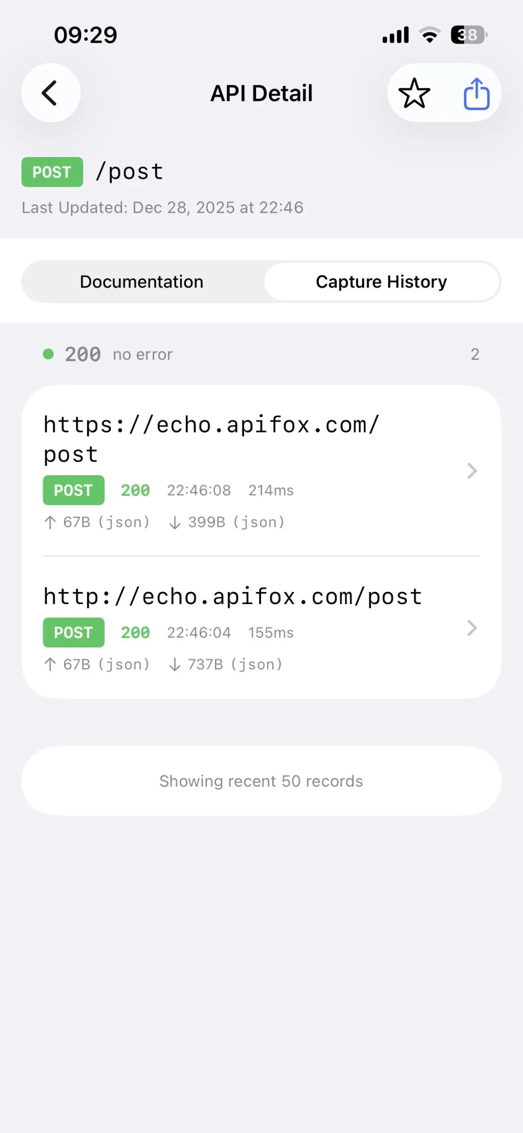 接口还会关联抓包记录,可以查看不同状态码的响应结果。比如抓包抓到一次响应200,一次响应500,可以看500的情况下,是返回Json吗,字段有哪些。还可以进入请求详情页通过重放功能,修改请求信息,继续测试接口的异常情况下的响应。最后,生成的接口文档会按域名分组,可以按域名导出所有接口到Postman或Apifox。