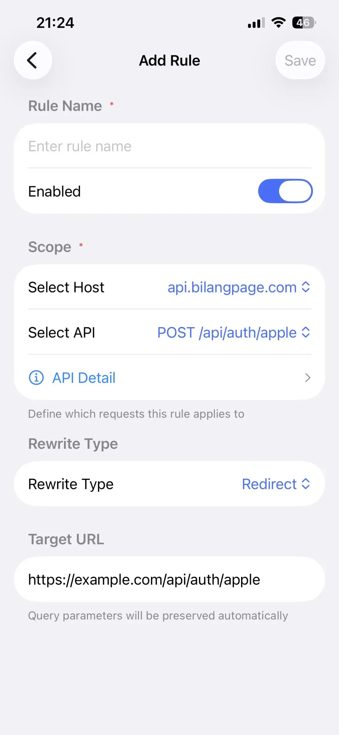 重写规则:填规则名称,选择作用在哪个接口上,选择重写类型,然后根据选择的重写类型填该填的。比如重定向填目标URL。