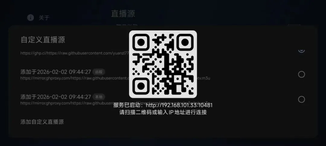 我们在添加直播源的时候需要用手机扫描电视上的二维码,再者之前我们需要保持电视和手机在同一个无线网局域网下才可以操作。