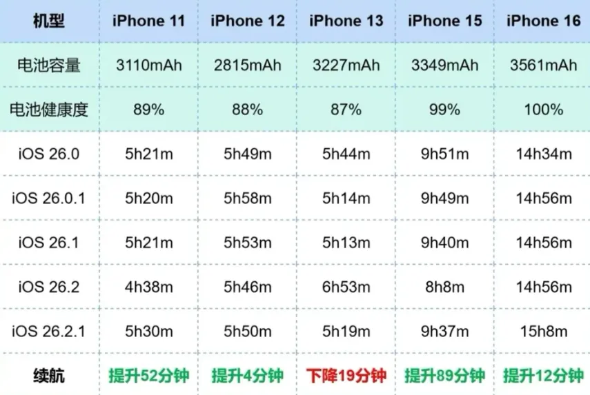 先把 iPhone 13说清楚,这台在上一版接近7小时的表现,到了 26.2.1只剩 5小时19分钟,少了 1小时34分钟,日常用到下午电量见底的情况更容易碰到,门店那会儿我们都把 13当那一年的续航标杆,这次看起来电源管理和 A15的特性不太对路,我给用 13的朋友一个简单做法,自动更新关掉,版本留在 iOS 26.2,外出不用再多带一块供电配件。