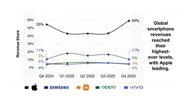 数据显示,在2025年,苹果一家公司,竟然拿走了整个智能手机市场将近六成的收入。你没听错,是59%。这意味着,全球其他所有手机厂商加在一起赚的钱,才勉强超过苹果一家。