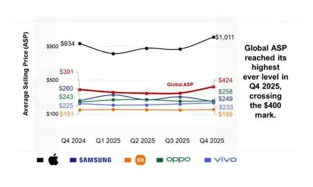 苹果手机的平均售价,在2025年冲到了1011美元的历史新高。而整个行业的平均价格,因为苹果的拉动,也才424美元。