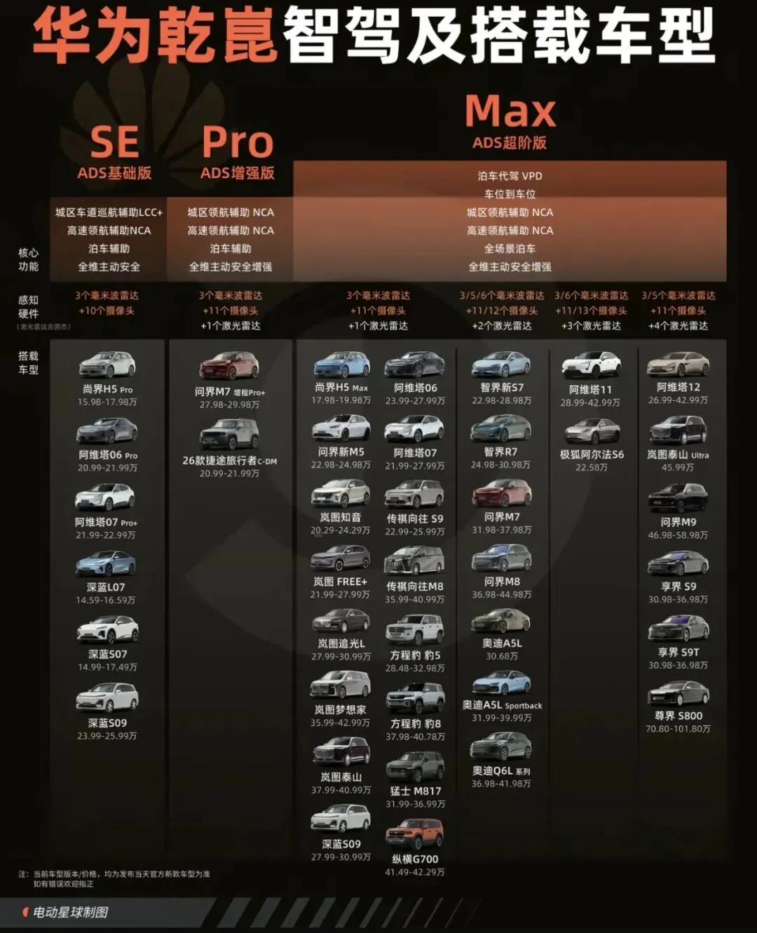 不完全统计,当前搭载华为乾崑智驾的车型已经超过30种,覆盖从15万到百万级的全价位区间。