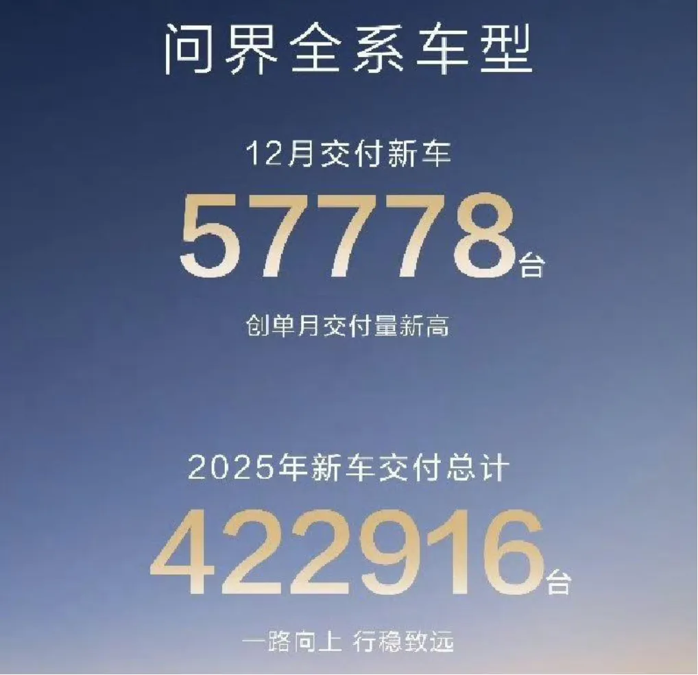 回顾2025年,鸿蒙智行的整体表现确实亮眼。全年累计交付新车58.91万辆,同比增长32%,其中12月单月交付89611台,连续第三个月刷新月度交付纪录。