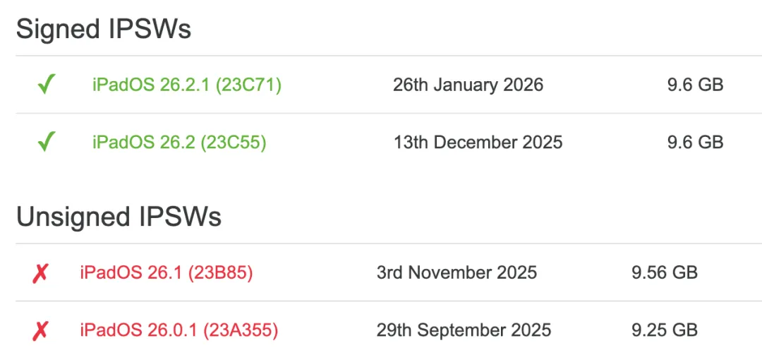 不过需要特别说明,目前很多第三方验证工具显示 iPad 8 的 iPadOS 18.7.4 验证还没开启,但实际上刷入固件是可以降级成功的。因此建议有需要的 iPad 8 用户,抓紧时间赶紧尝试。