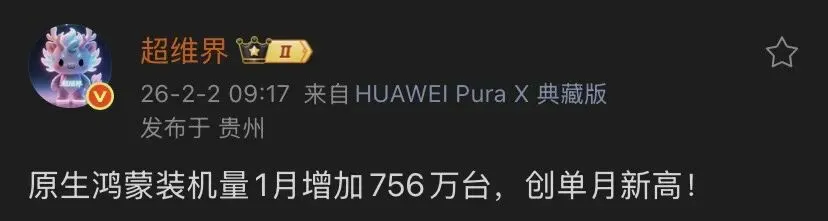 这两大软件系统在2026年1月单月新增装机量达756.11万台,打破了鸿蒙4.0等所有前代版本的纪录。从新图表来看,纯鸿蒙系统在2025年10月实现装机401.36万台,月增长19.6%。此后,软件版本月增长率达13.2%,在2025年11月装机量达323.47万台。