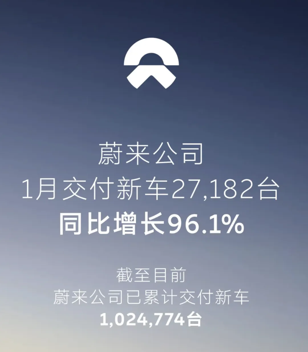 蔚来1月交付27182台,同比增长96.1%,环比下降43.5%。其中,全新ES8交付开启134天完成第60,000辆交付。