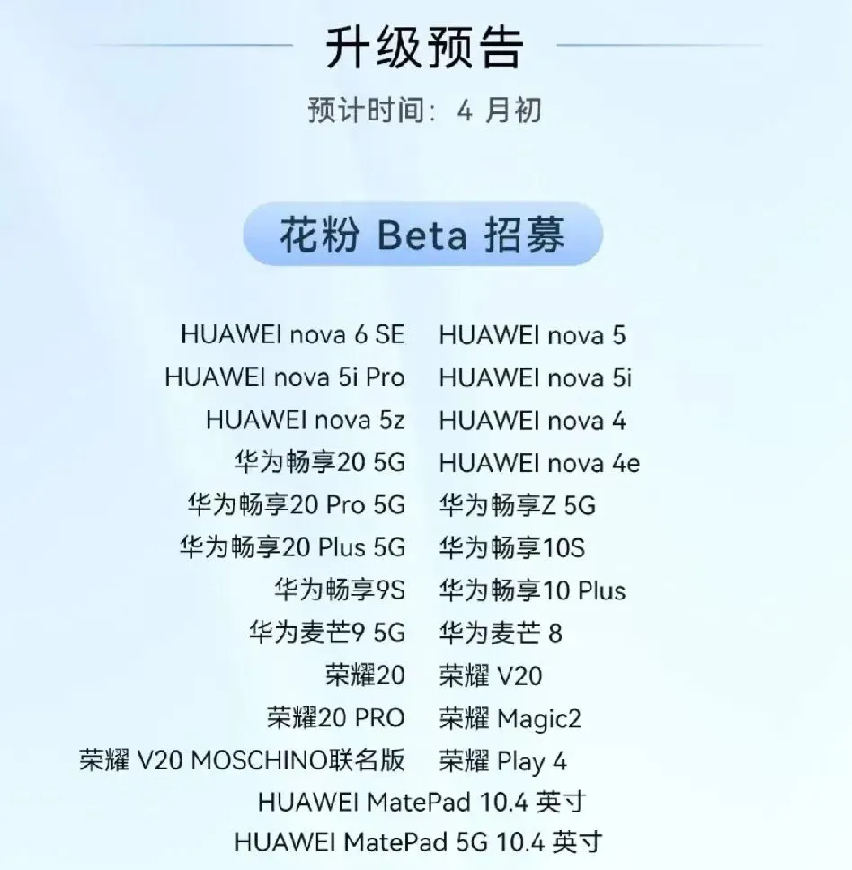 另外官方还发布升级预告:4月HarmonyOs3.0 beta版本招募机型,Harmony3.0系统常用常新,邀您纵享丝滑,看看有没有你的手机型号?