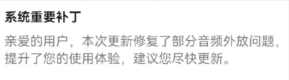 我们不妨看看这次更新日志里的猫腻,官方非常直白地标注了“系统重要补丁”,核心任务就是修复部分音频外放的异常问题。