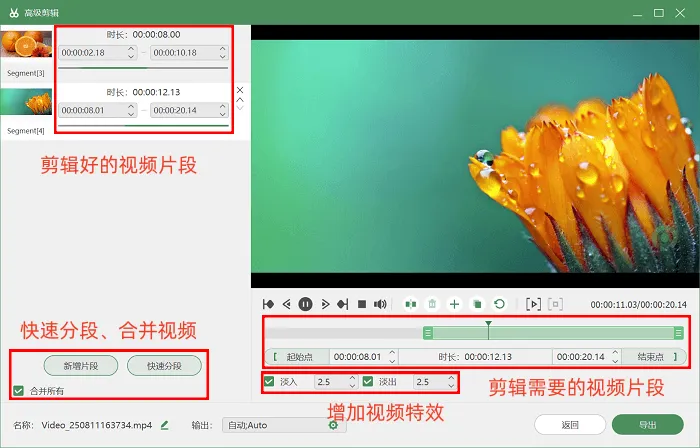 3. 录制完成后,用户通过页面下方的【高级剪辑】工具,可对视频进行快速分段、剪切、删除等后期处理,进一步提升最终呈现的效果质量。