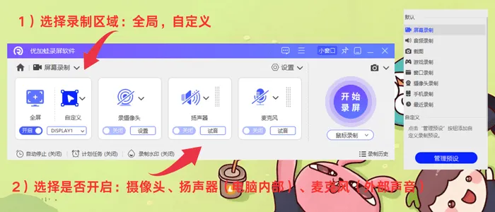 好用的录制软件有哪些?优加蛙录屏软件涵盖多种录制模式,包括全屏录制、自定义区域录制、窗口录制、游戏录制、音频录制以及摄像头画中画录制等,可适配不同使用场景。