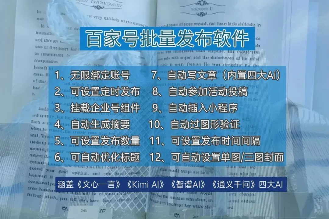 千山甲百家号智能群发软件具备多项强大的功能,能够全面覆盖内容发布的各个环节。首先,它支持无限绑定多个账号,让用户可以同时管理多个百家号,节省大量时间和精力。其次,软件内置AI自动写文章功能,可以根据用户设定的关键词生成高质量的文案,提升内容创作的效率。此外,软件还支持自动切换IP地址,避免因频繁操作被平台限制,确保发布过程的稳定性。