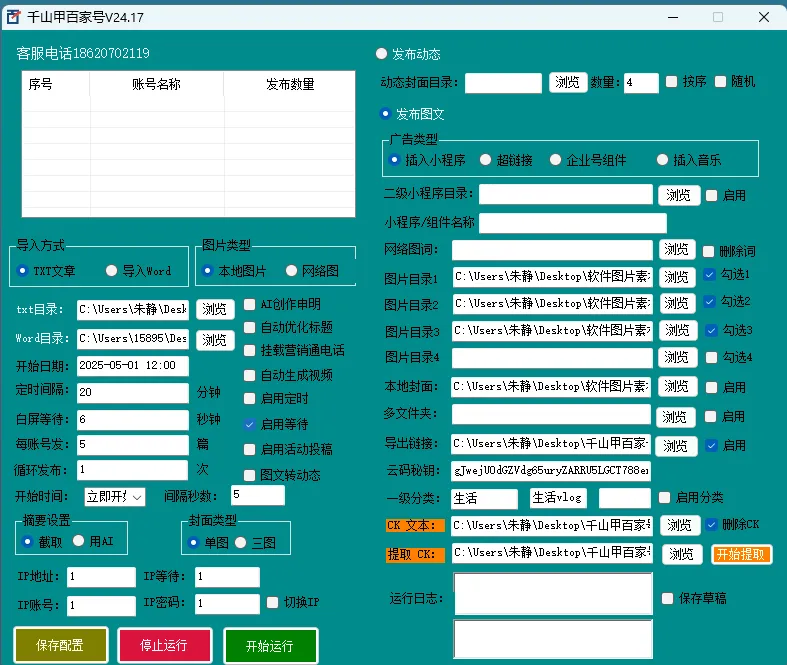 除了基础功能外,千山甲百家号智能群发软件还具备企业营销相关的高级功能。例如,可以自动插入企业营销组件、小程序和本地音乐,提升内容的专业性和互动性。同时,软件支持根据关键词生成文案,帮助用户精准匹配目标受众,提高内容的相关性和吸引力。此外,软件支持CK登录方式,简化了账号管理流程,让操作更加便捷。