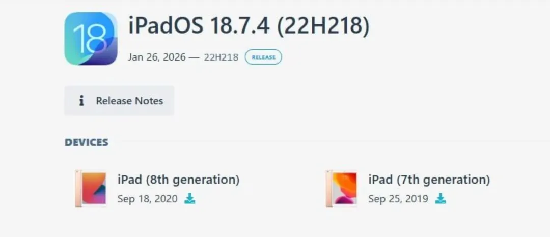 这意味着已升级到 iPadOS 26 的 iPad 8 ,现在可以降级回 iPadOS 18.7.4 系统了。