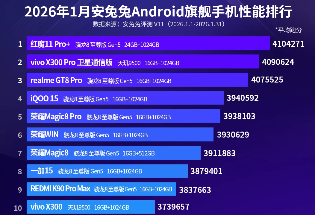 如上图所示,排名前十的手机分别是红魔11 pro+、vivo x300 pro 卫星通信版、realme真我GT 8 pro、iqoo 15、荣耀magic 8 pro、荣耀WIN、荣耀magic 8、一加15、红米k90 pro max、vivo x300。